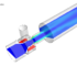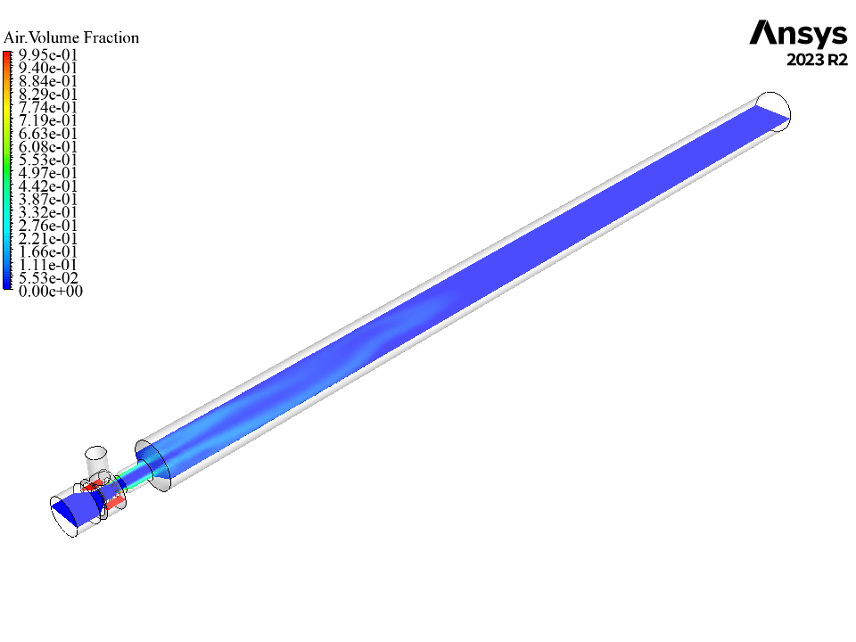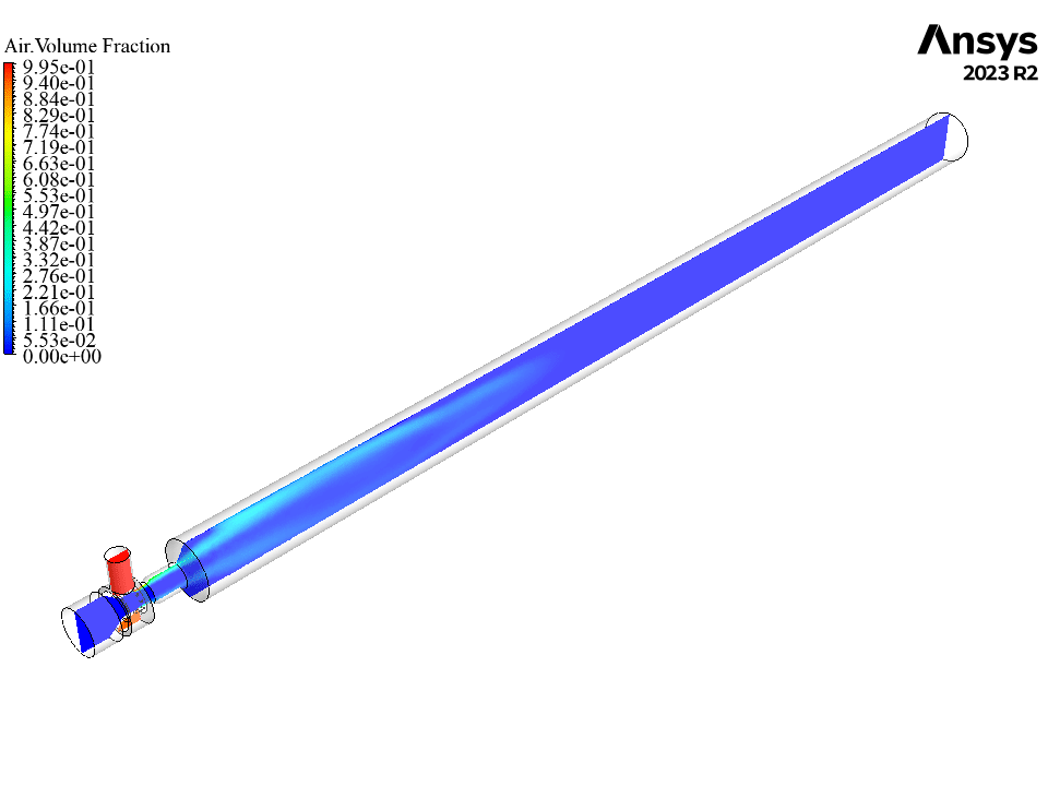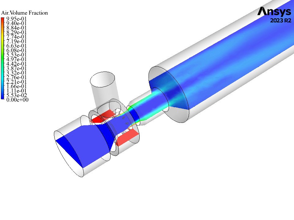 The air volume fraction contours reveal the distribution of air throughout the venturi nozzle. A high concentration of air is observed at the top inlet and in the upper portion of the long tube. As the flow progresses through the constriction, there’s a notable reduction in the air fraction, indicating acceleration and possible mixing with water.