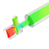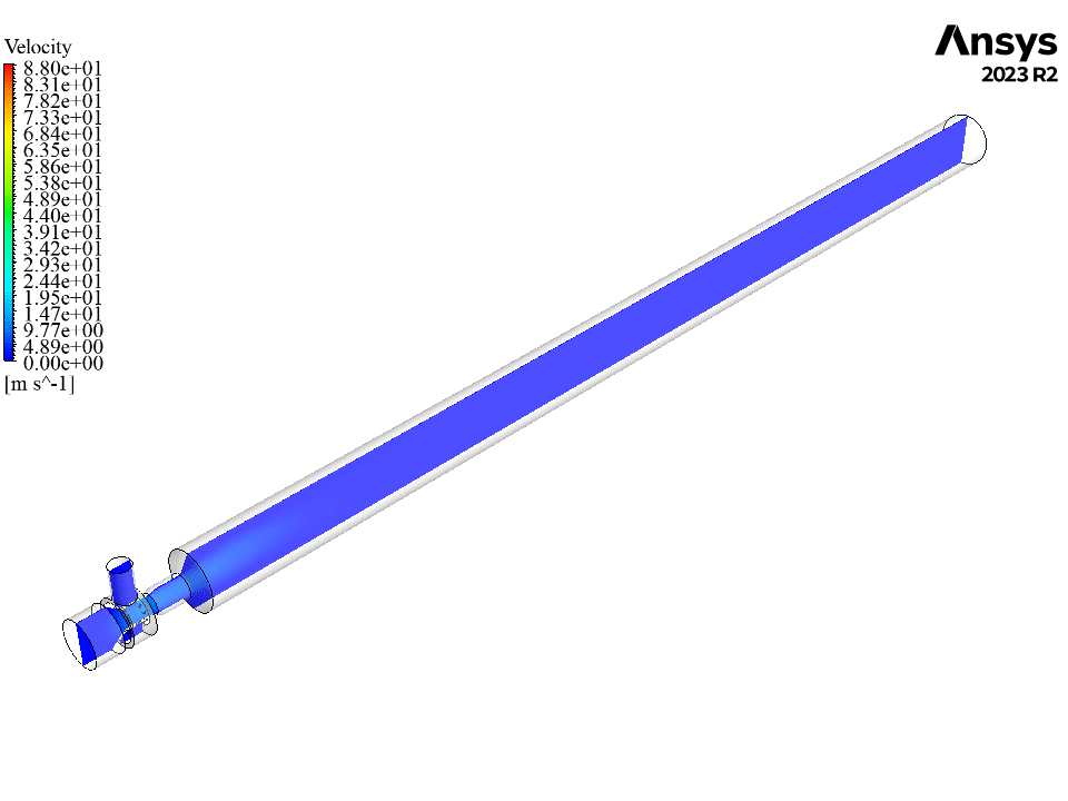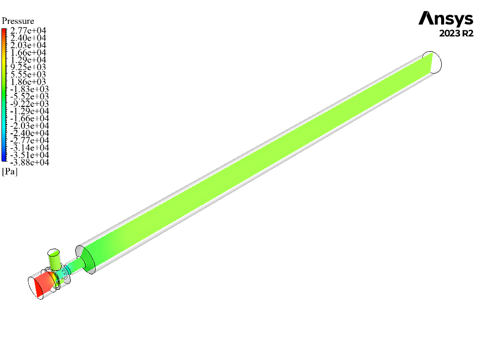 The pressure contours demonstrate the characteristic pressure distribution in a venturi system. A high-pressure region is observed at the water inlet and the beginning of the long tube. As the flow approaches the constriction, there’s a significant pressure drop, followed by a gradual pressure recovery in the expanding section. This pressure variation is crucial for the venturi effect and the nozzle’s operation.