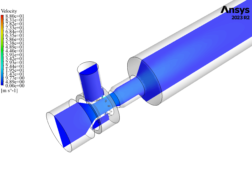 ANSYS Meshing was employed to generate a high-quality mesh comprising 829,367 cells. This mesh density provides sufficient resolution to accurately capture the multiphase flow dynamics, turbulence effects, and pressure variations within the domain. The mesh quality ensures efficient computation and helps in resolving the complex flow patterns expected in the venturi nozzle.