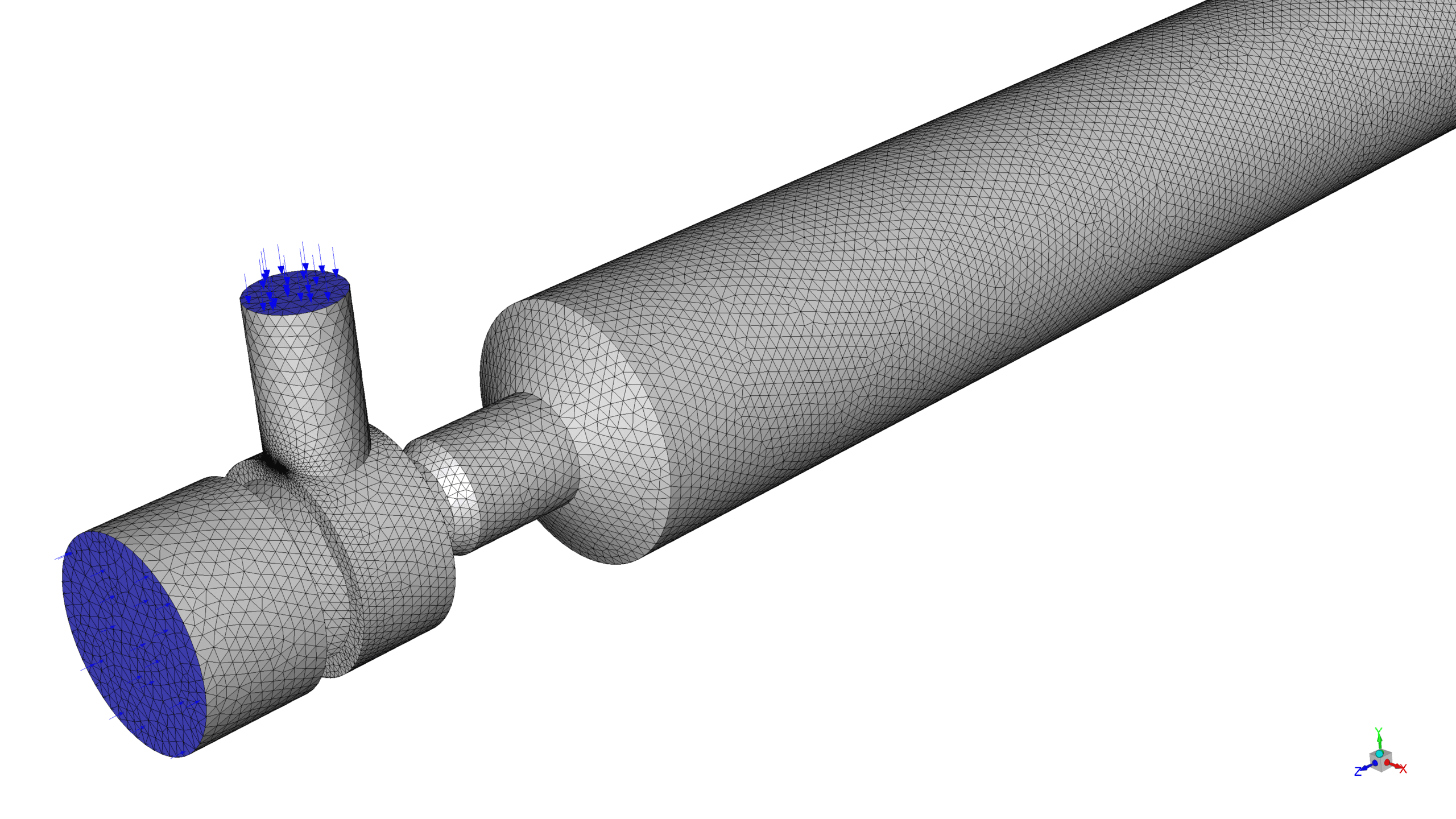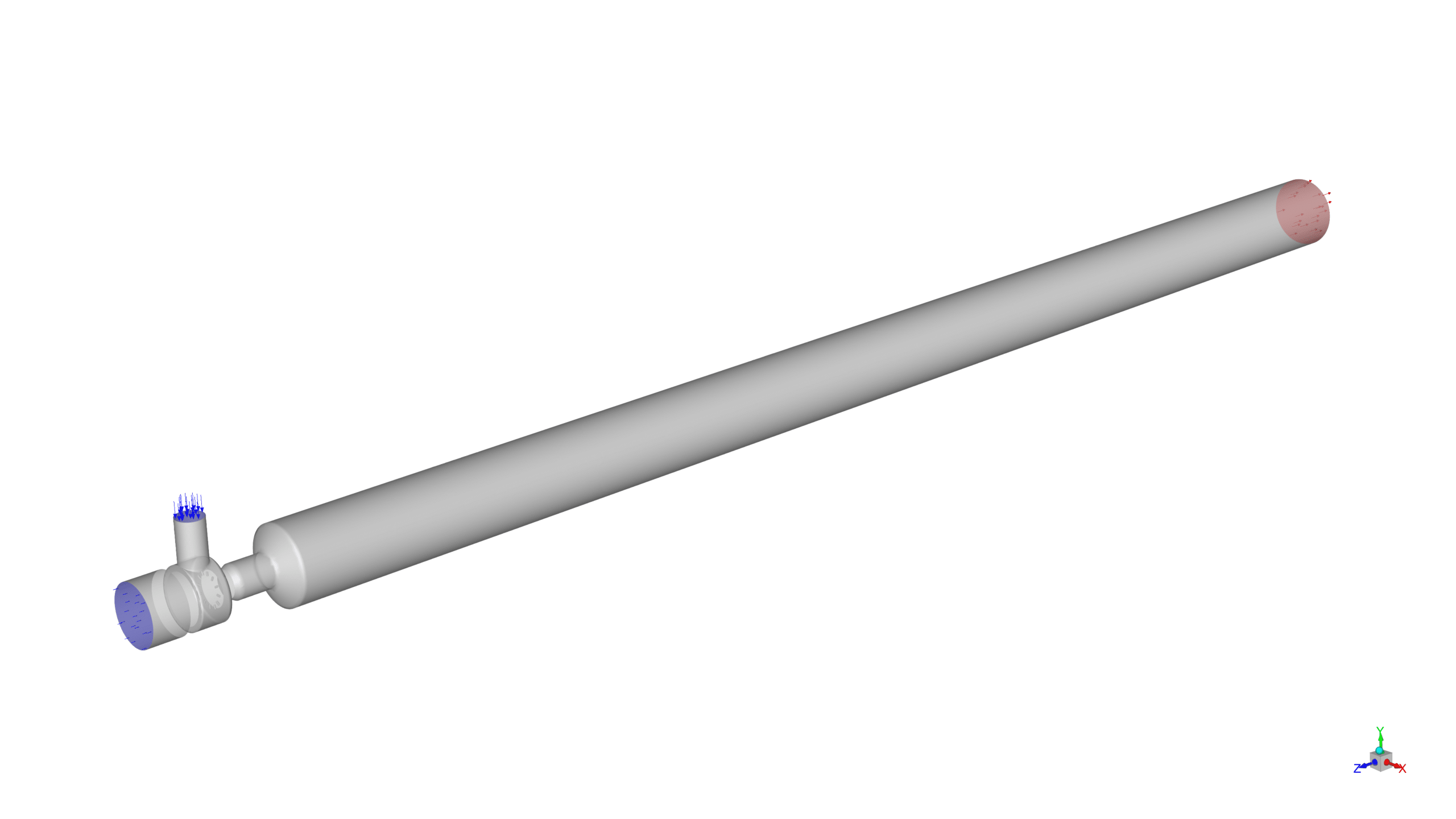 The simulation geometry, designed using ANSYS Design Modeler, consists of a venturi-shaped nozzle with a long, narrow tube and a constricted section. The domain includes an air inlet at the top and a water inlet on the left side, allowing for the investigation of the interaction between the two phases. The geometry is optimized to capture the flow acceleration through the constriction and the subsequent expansion.