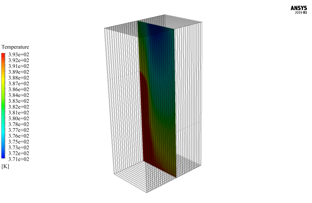 The present problem simulates heat transfer in a three-dimensional vertical heat exchanger using ANSYS Fluent software. This heat exchanger is designed vertically; In this way, the flow of cold fluid enters from the upper part of one of the sidewalls of the heat exchanger and exits from the lower portion of the sidewall in front of it; While the flow of hot fluid from the floor of the heat exchanger enters vertically and upwards and exits the ceiling. Cold fluid flow enters the heat exchanger at a velocity of 8.88 ms-1 and temperature of 239.15 K through 30 vents. Hot fluid flow enters the heat exchanger at a velocity of 15.23 ms-1 and temperature of 393.15 K through 30 vents.