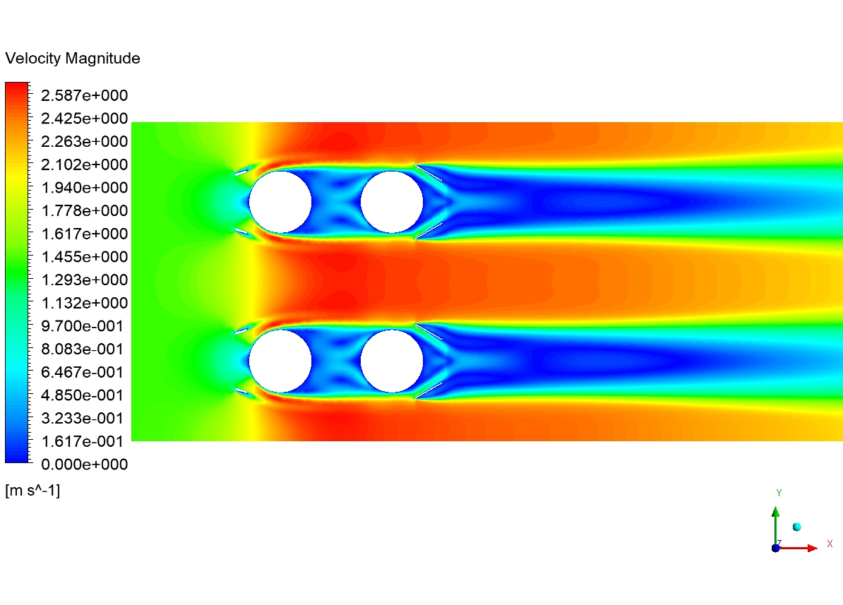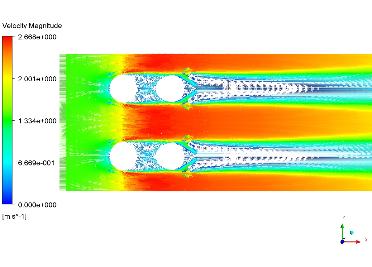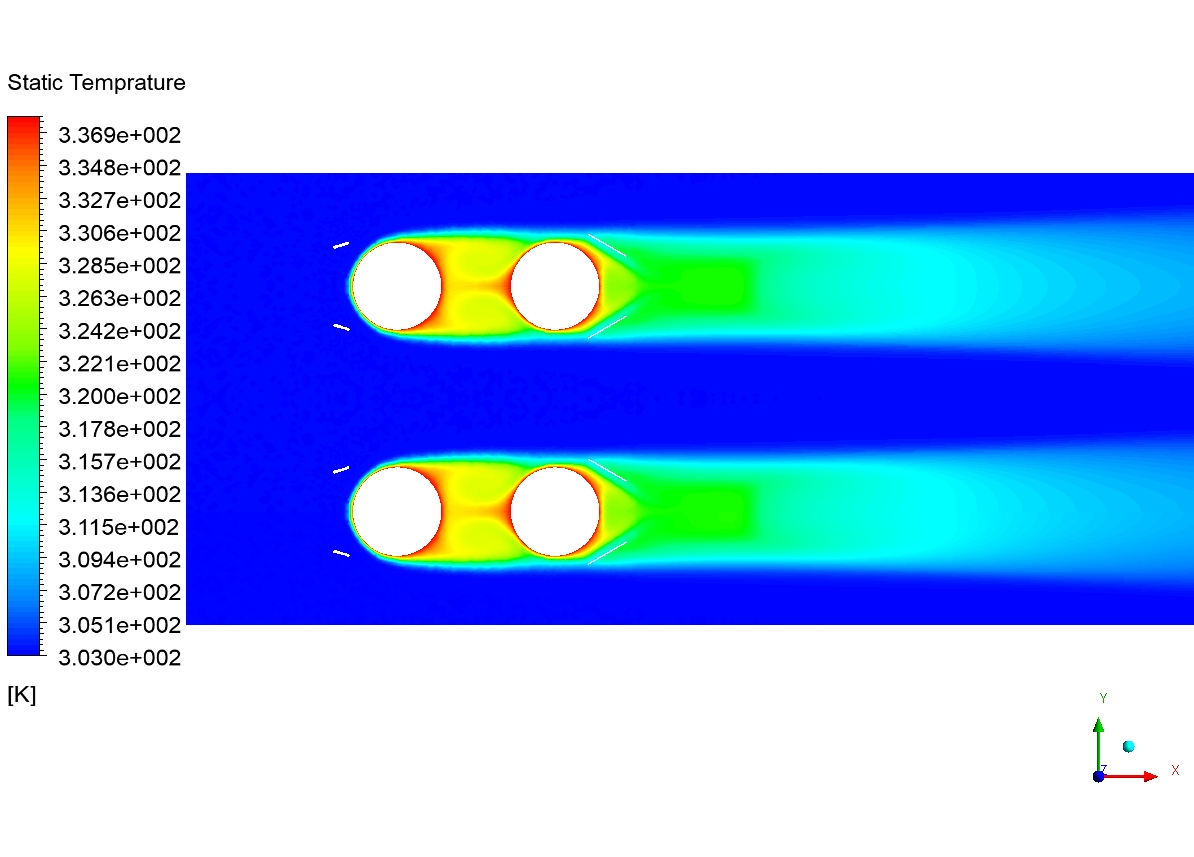 Examining the pressure contour shows that a pressure drop occurs in the flow path passing through the pipe. This pressure drop is due to surface friction. A sudden drop in pressure along the walls causes the flow to separate. We can see this separation in the form of a wake behind the pipes. The velocity vectors illustrate this well. From the temperature contour, it is clear that the airflow in the areas behind the pipe has a higher temperature than in other areas. It means that the Wake areas have low heat transfer. Since this research project aims to increase the heat transfer rate and reduce the heat exchanger volume, we can reduce the Wake areas.