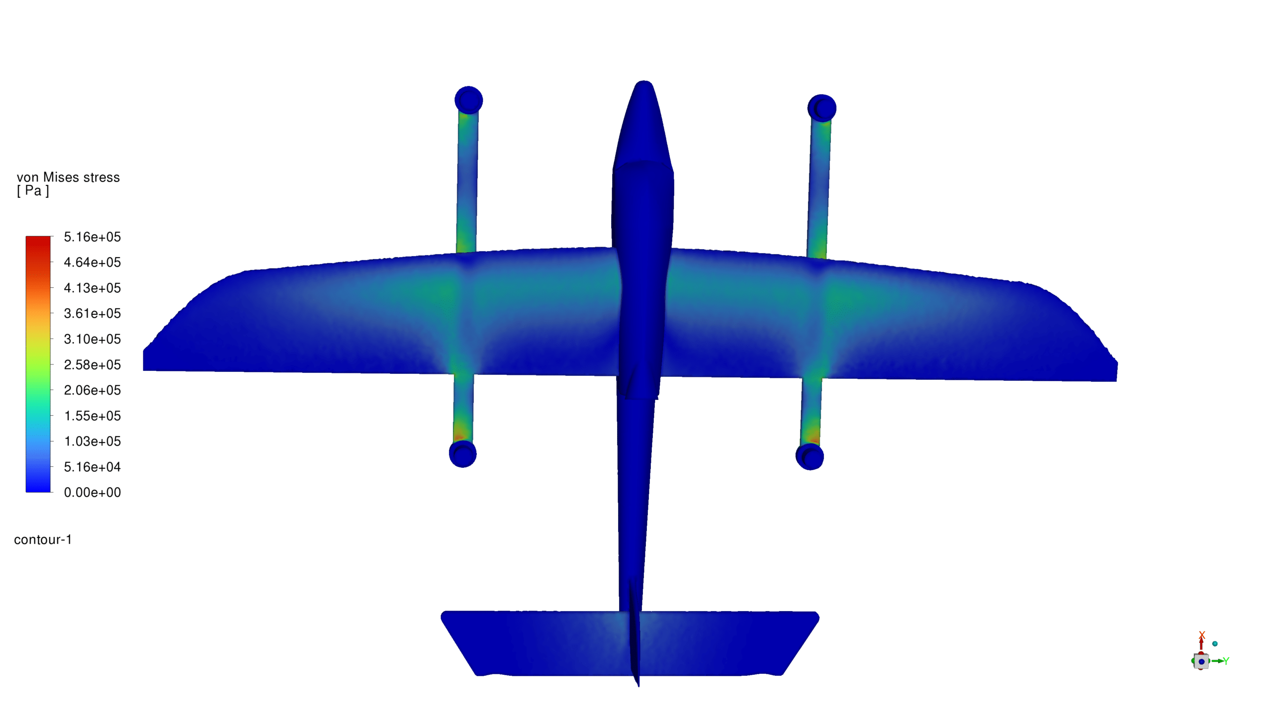 According to the extracted contours, it is observed that, as expected, the greatest displacement occurs at the wing tips of the UAV and the greatest stress is at the wing-body connection.