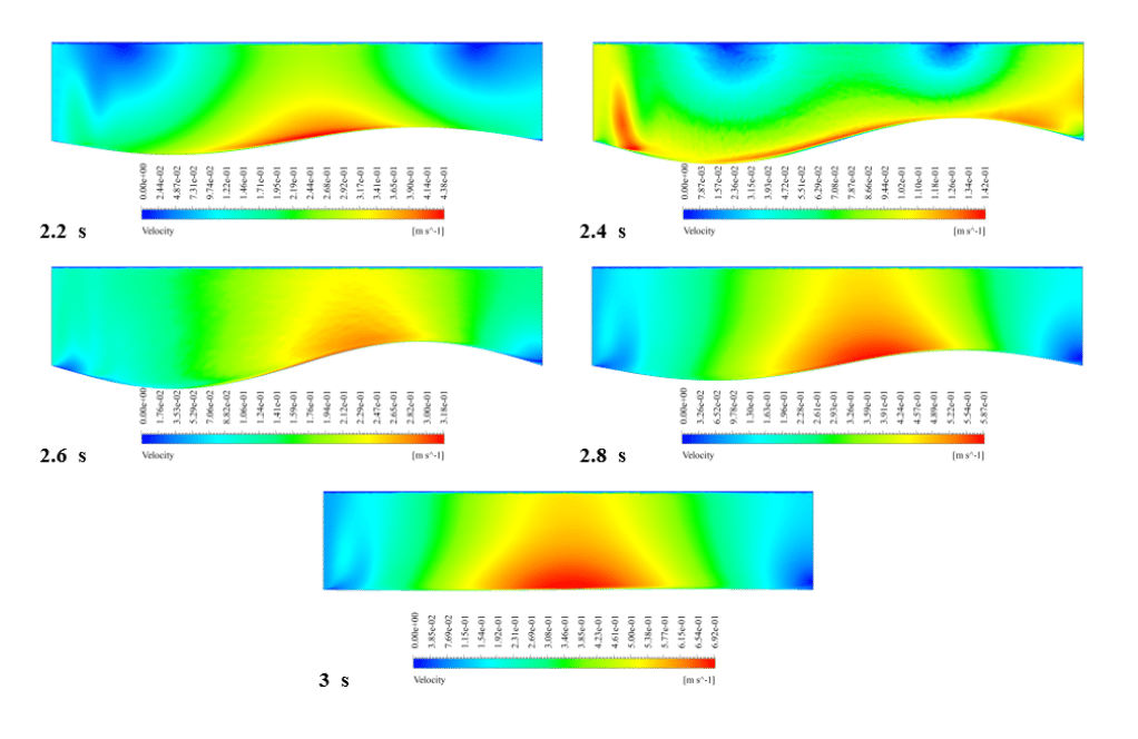 The results show that the pressure and velocity are constantly changing under the influence of the wave motion of the channel wall. The wave motion causes the cross-section of the flow to change along the channel. As the cross-section decreases, the velocity increases, and the pressure decreases. If the cross-section increases, the velocity decreases, and the pressure increases.