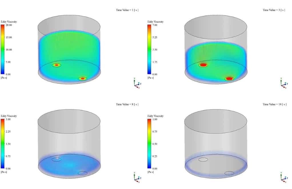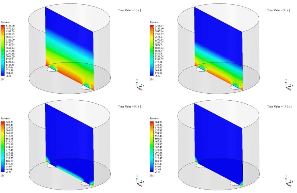 After the solution process is completed, contours of Pressure, Water volume fraction, Eddy viscosity, and Streamline are extracted. As can be observed, under the influence of gravity and the rotational speed of the tank, the water inside the cylinder tank rotates about the y-axis as it exits the orifice.