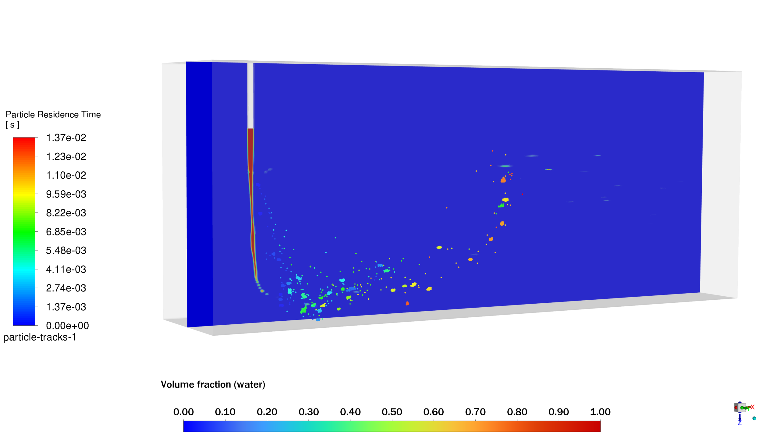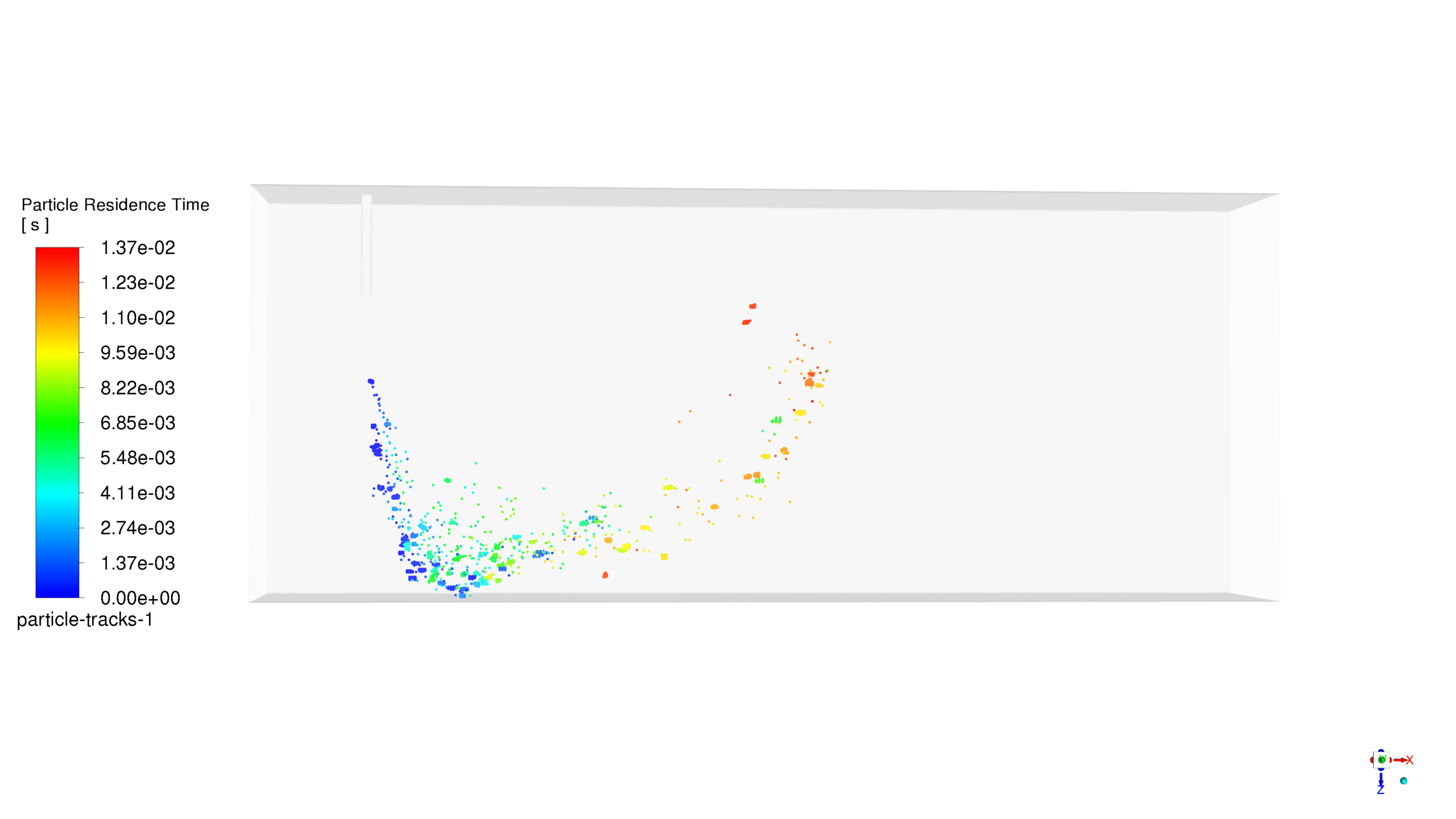 Particle track visualization shows residence times ranging from 0 to 1.37e-02 seconds, indicating droplet dispersion and lifetime.