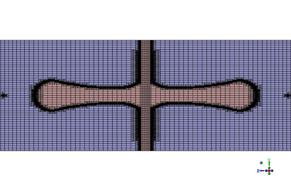 In this simulation, the automatic mesh adaptation is utilized to refine or coarsen the mesh dynamically as the simulation progresses. Initially, when the jets are not present, a coarser mesh is sufficient. As the water jets begin to impinge and form a fluid-air interface, the mesh automatically refines in that region to capture the flow intricacies and droplet formation accurately. After droplets form and the focus is no longer on the interface, the mesh can revert to its original size, conserving computational resources while still resolving necessary details. This adaptive process ensures a balance between numerical accuracy and computational efficiency.