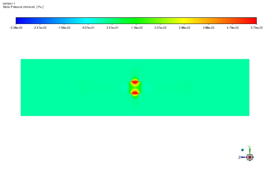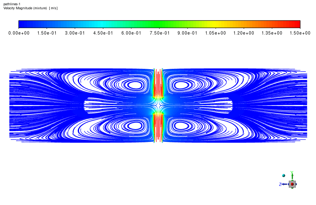 As shown in the results, as the two jets impinge on each other, a planar surface of the liquid is formed. Meanwhile, some particles are also formed due to the intensity of the jet’s impact. As time goes by, the liquid surface starts to expand, and more particles are formed on the body of jets, accumulating over the expanded surface of the water in the middle of the domain. Their velocity starts to decrease as they near the liquid surface while they have different diameters.