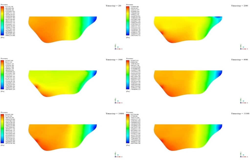 After the solution process is completed, contours of velocity, pressure, pollutant volume fraction, Water volume fraction, Eddy viscosity, and streamline are extracted and presented in different time steps.