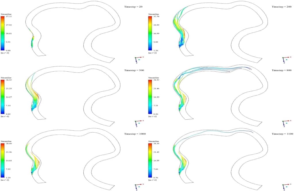 In our simulation, we accounted for the difference in flow velocities. Since the pollutant enters the water with a lower speed, it initially has less momentum compared to the river water. However, the dispersion and spread of pollution are not solely reliant on the inlet velocity of the pollutant; river flow, turbulence, and diffusion play significant roles. The slower movement of the pollutant compared to the river’s flow allows for observable diffusion and mixing over time, which is fully captured in our CFD results. Through streamline and volume fraction contours, the simulation represents the dilution and downstream transport of the pollutant. Also, fluid dynamics principles such as advection and diffusion are considered to accurately showcase the pollution pattern within the river in our transient analysis.