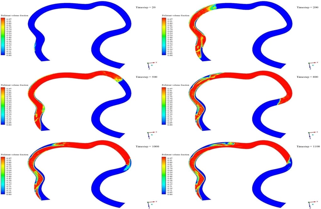 As can be seen, the pollutant enters the river from two circular inlet profiles and diffuses through time into the river’s surface. Due to the water flow, pollution spreads through the river’s surface and causes massive river pollution.