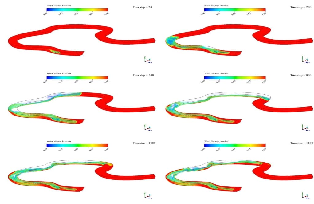 The detailed simulation captures the dispersion of pollutants in a meandering river very well. It’s interesting to see the use of VOF and the effect of river surface contamination visualized over time. Great work!