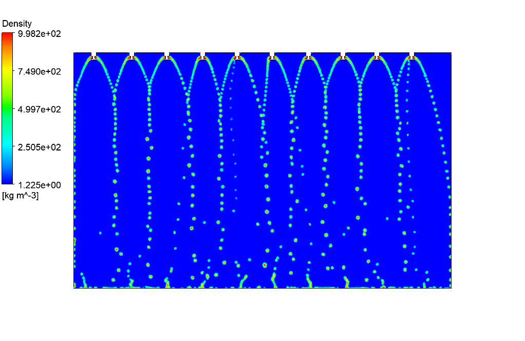 At the end of the solution process, two-dimensional and three-dimensional velocity, air, and water volume fraction are obtained. This 2-D simulation shows that water starts to pump through the conservatory roof watering system nozzles, drops down, and covers the bottom surface.