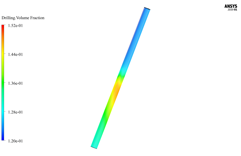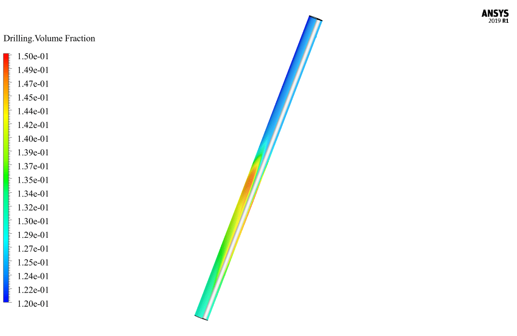 The Eulerian multiphase model used in this simulation is capable of handling a range of particle sizes, including small particles in the drilling fluid. However, depending on the specific discretization and numerical setup as well as the computational resources available, there may be limitations to the smallest particles that can be captured accurately without significant computational cost. Very small particles might require a finer mesh and more complex models to capture their behavior accurately.