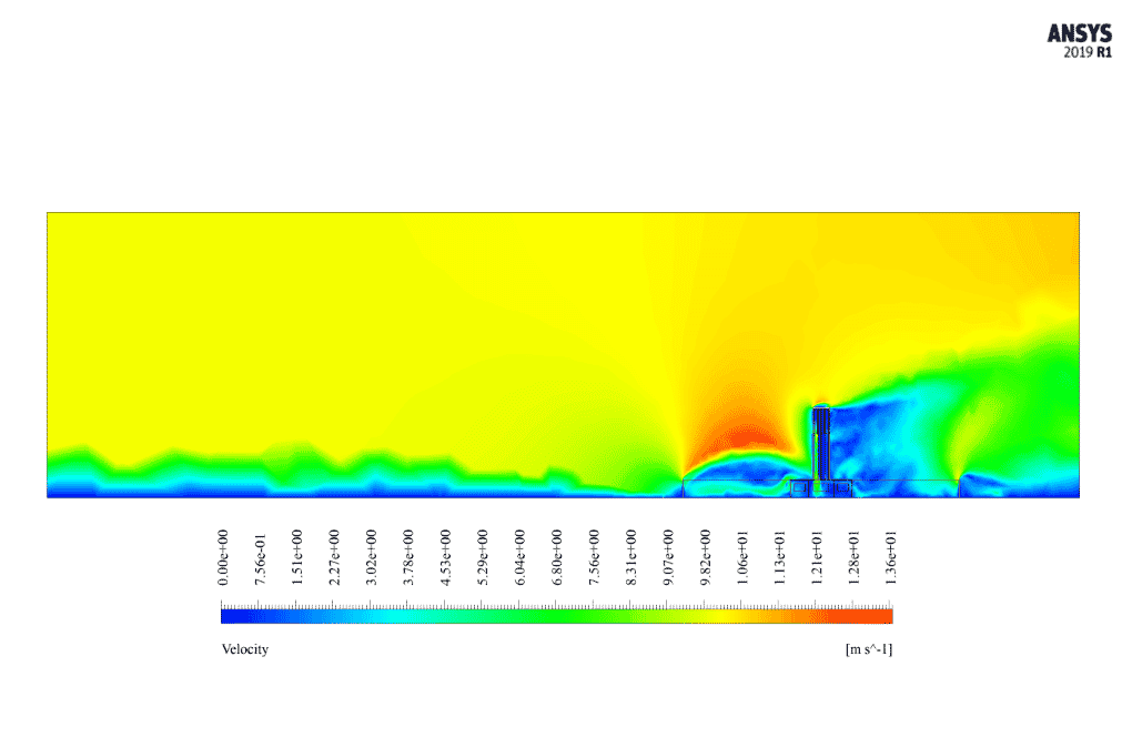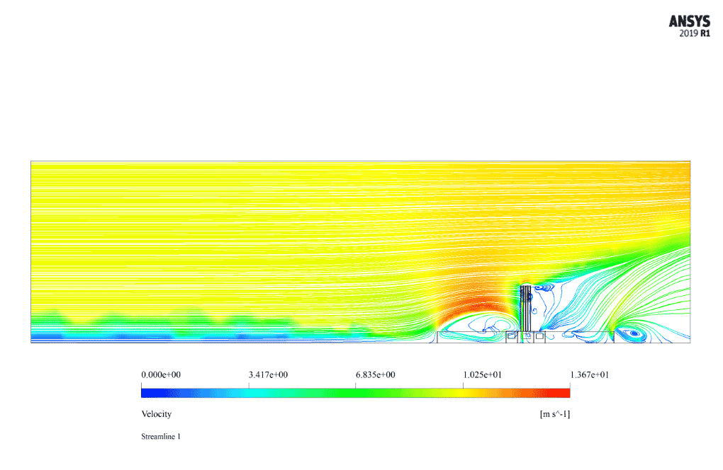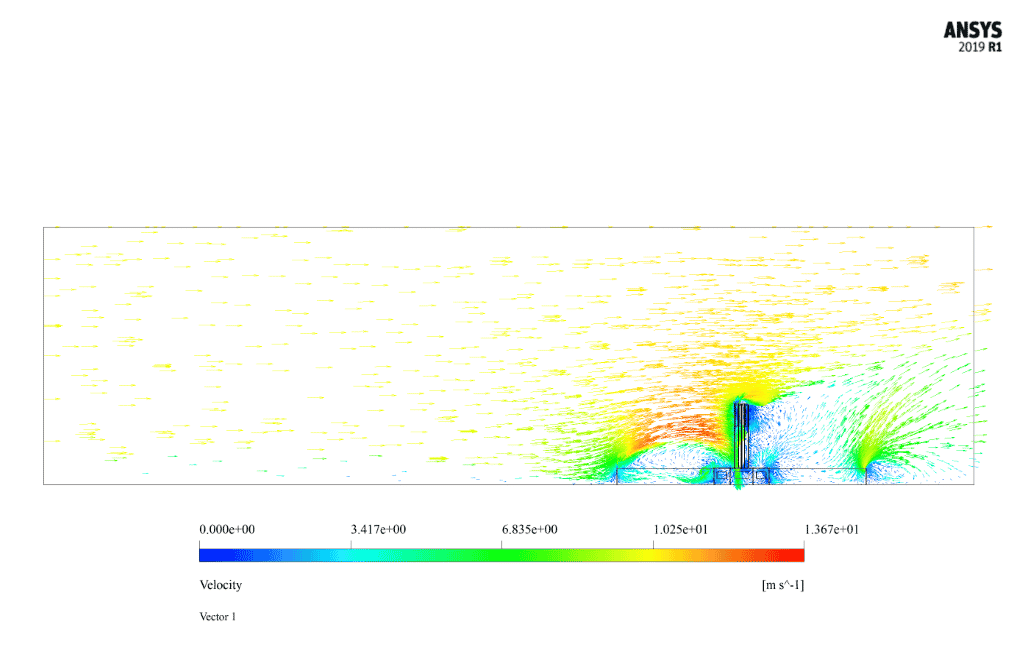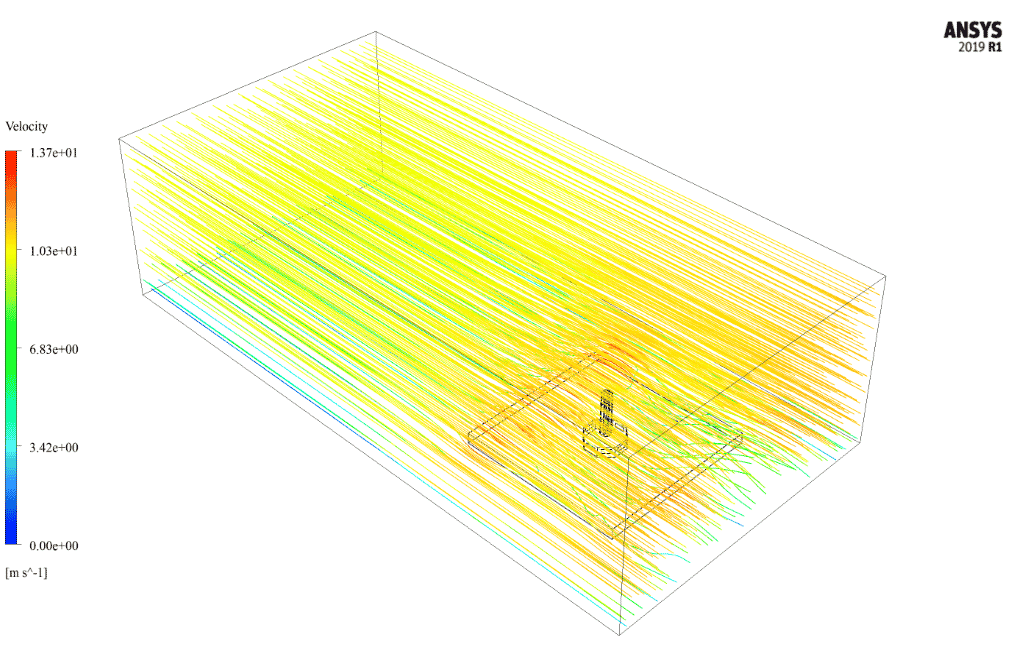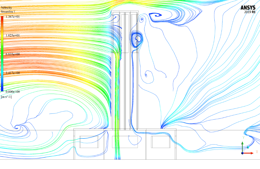 Also, the vectors and pathlines clearly show that the airflow enters from the top panels of the windshield tower and, after being trapped, moves downwards and is transferred from the lower panels of the windshield to the building’s interior. So, in conclusion, the system of this windshield is working properly.