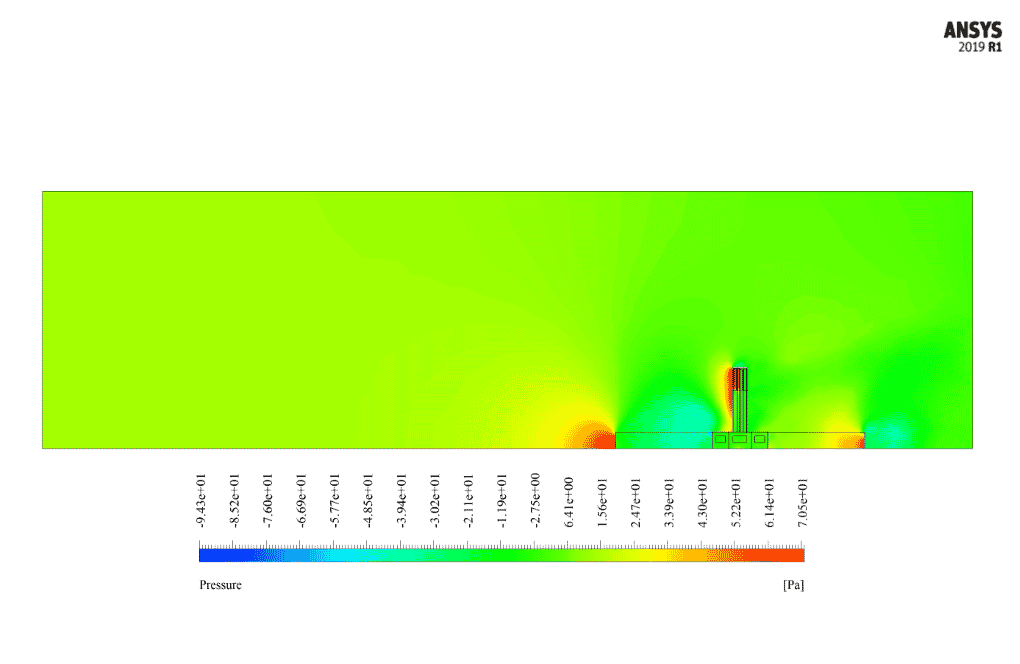 This model set is located in a large space of open airflow domain. The wind moves horizontally at 10 m/s towards the windbreak building. Also, the model pressure is equal to atmospheric pressure.