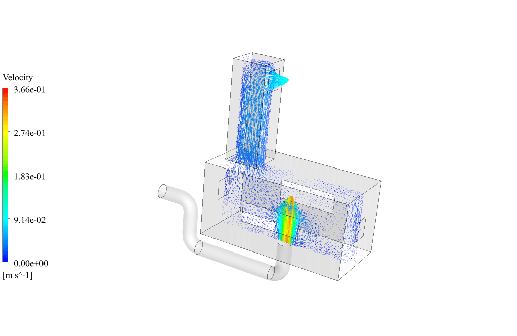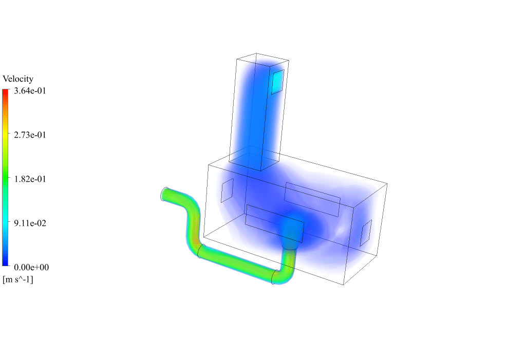 Velocity vectors show the direction of air movement inside the room and tower well. Cool air enters the room at high speed from the floor, and after full circulation in the room and air conditioning, it leaves through the tower.