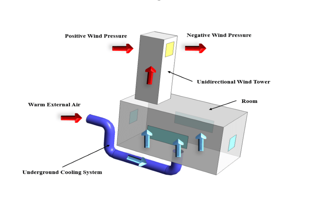 In this system, a tall wind tower is placed on top of the building, and an underground cooling system is considered. In this project, we are using qanat as an example of a common underground cooling system.